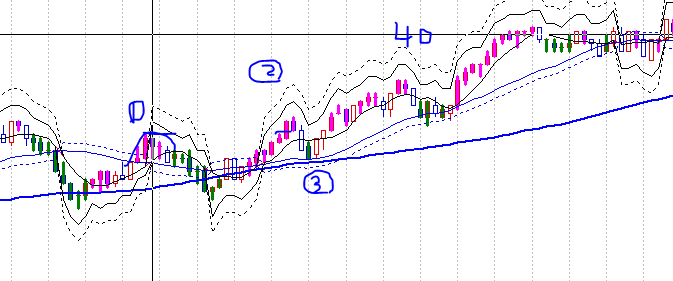 3번- 조정을 이동평균선5를 종가로 2번이상 넘고 (이동평균선 20 더하기2틱)을 안 넘음