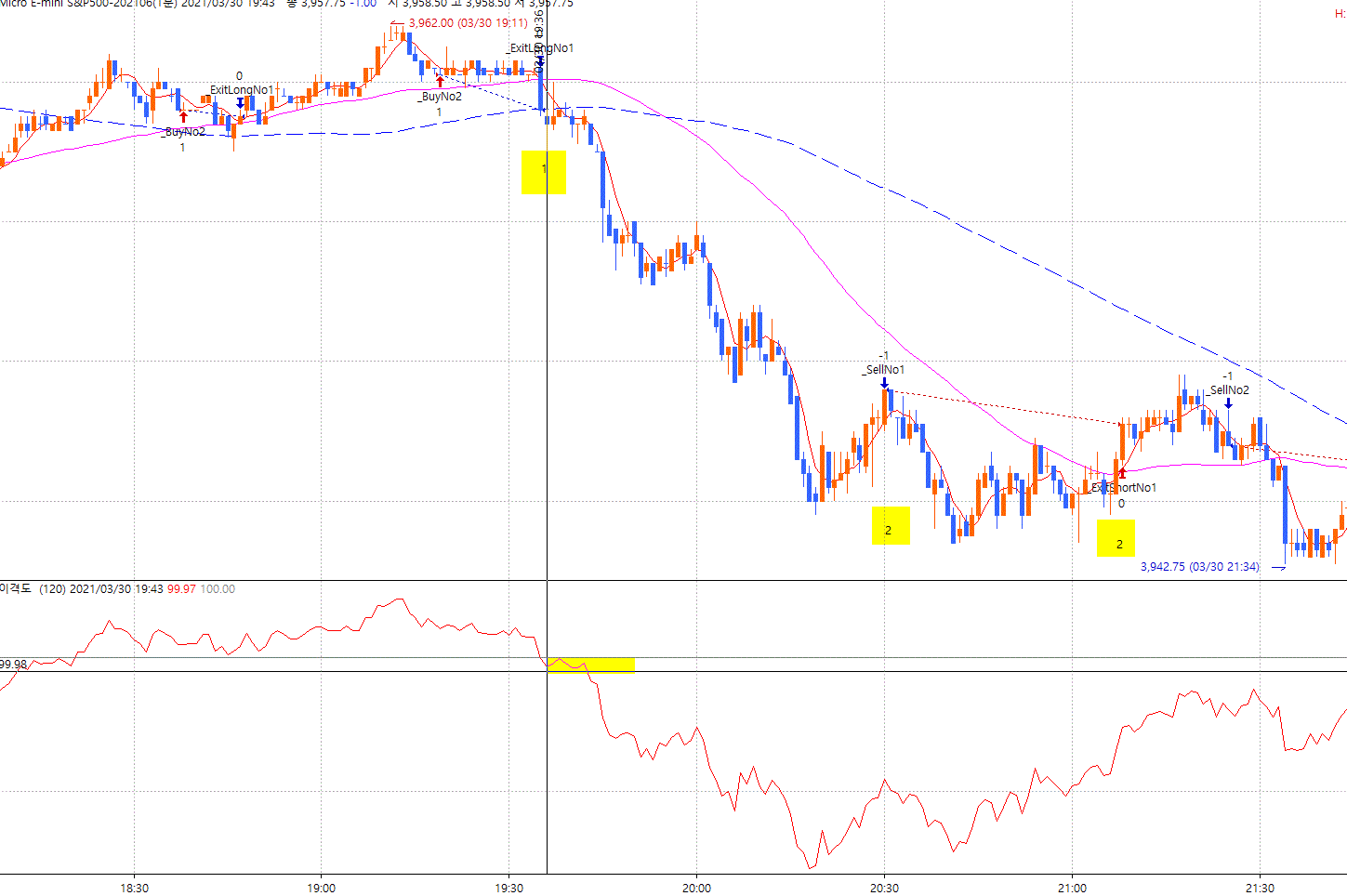 1. buy 손절후 이격도 120의 기준선 100 에서 99.80 사이일때