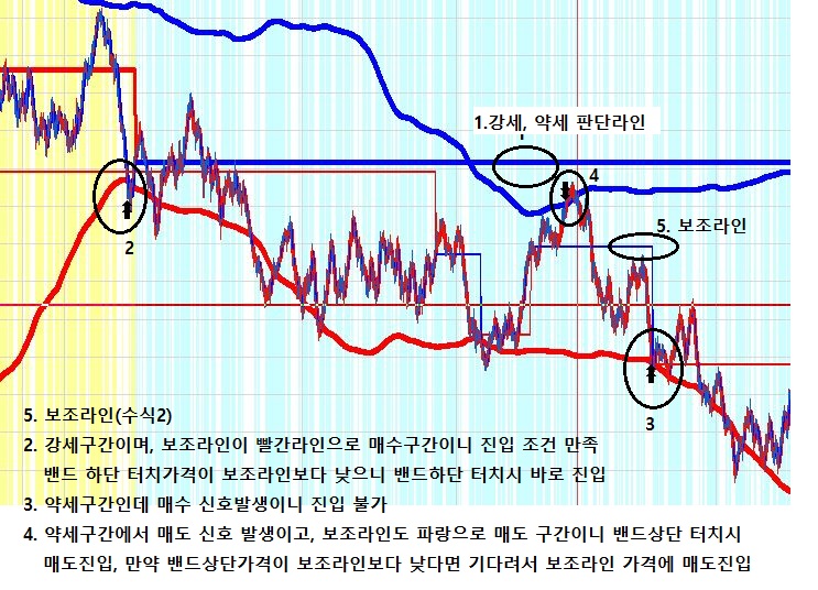- 만약, 강세구간에서 매수 신호가 발생하였다 하더라도 보조라인(수식2)이 매도 구간이라면 매수로 전환될때까지 기다려서 매수라인 가격에 진입