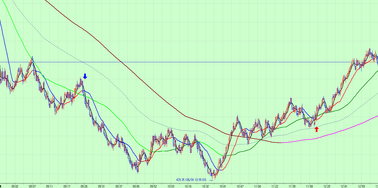 20선이 60과 240사이로 들어왔다가(20과 60이 골든크로스) 20선의 기울기가 음으로 바뀌는 음봉에서 매도 진입(이때 20선이 60과 240사이에 있어야함)