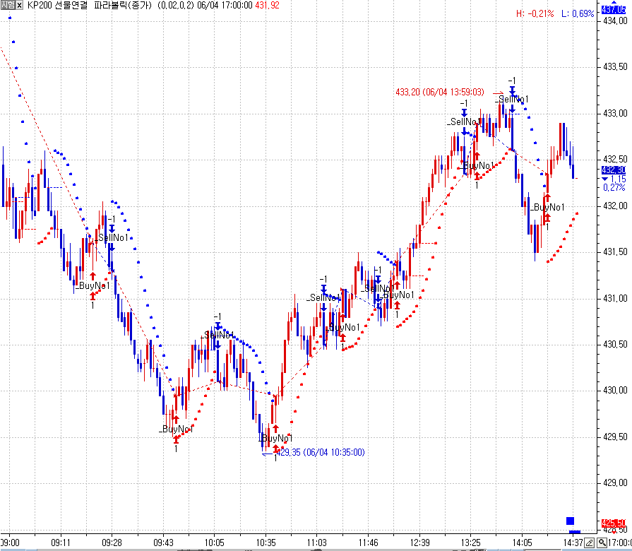 > 당일 기준 당일 시가 이후 파라볼릭 양전환후 3회 양전환 나타나고 첫번째 음전환에 매도