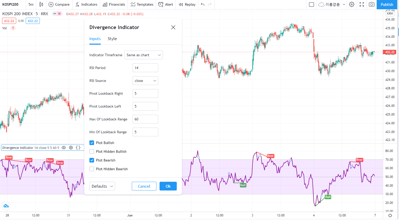 예스에서 구현할 rsi 다이버전스 지표식 부탁드립니다.