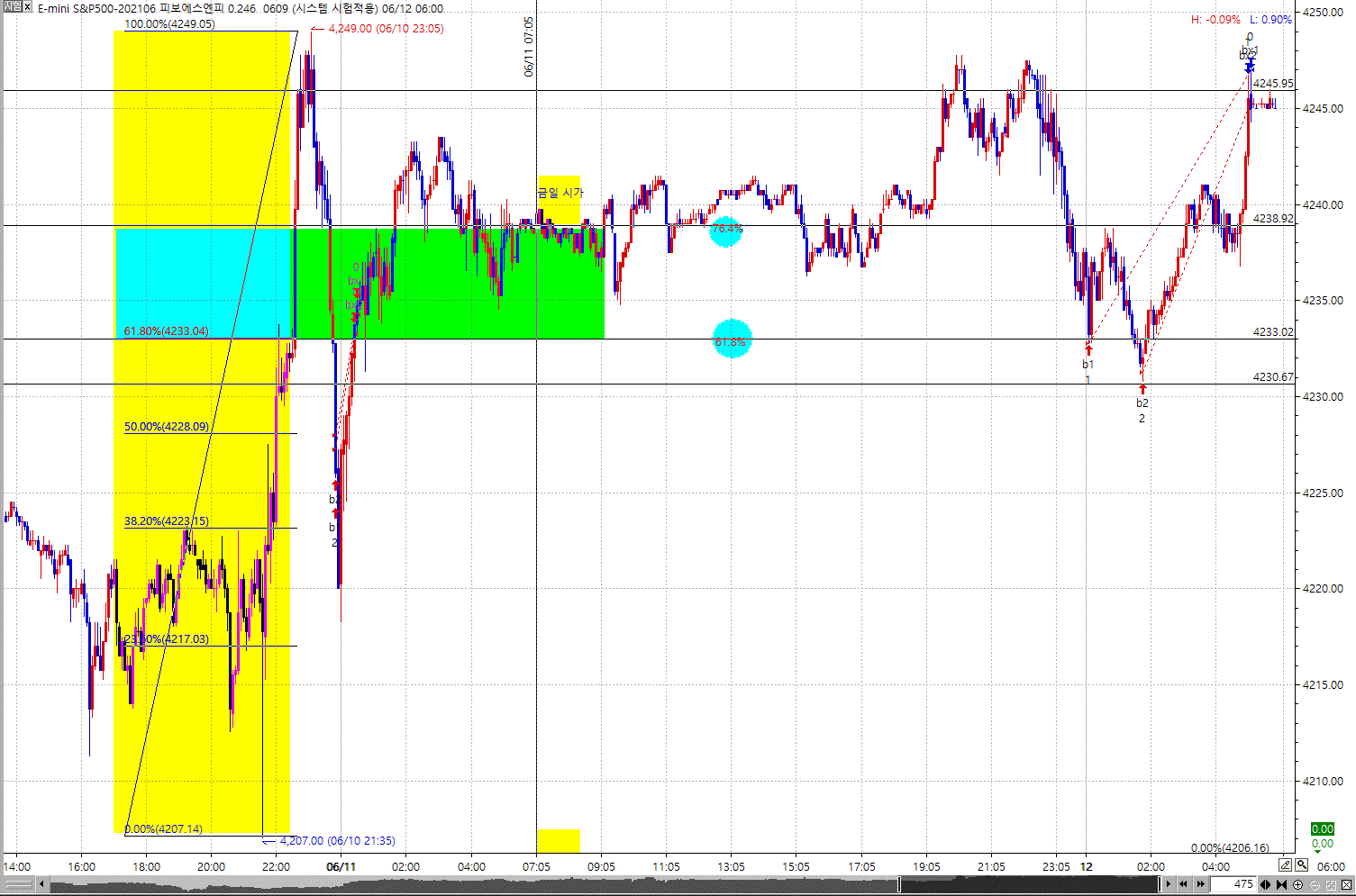 전일 피보나치 수열을 하단 0 상단 100 으로 했을때 당일 시가가 전일의 61.8 ~ 76.4 %