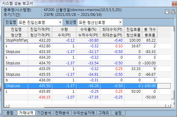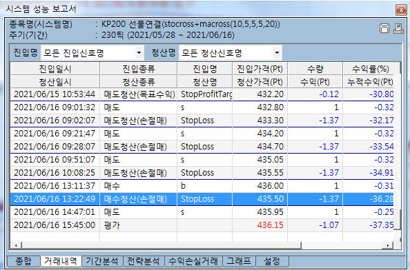 성능보고서의 6/16 거래내역에 각 거래별 수익이 -1.37로 되어 있는데