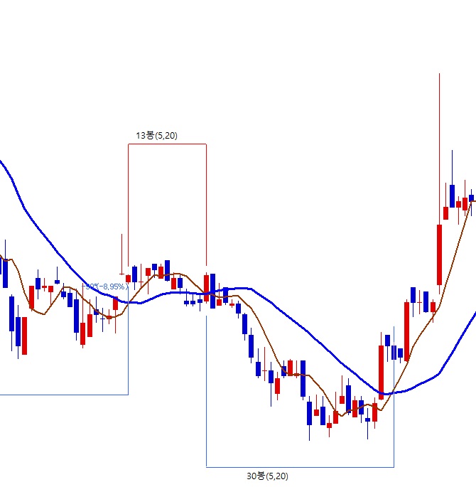 > 5일 이평선이 20일 이평과 크로스하는 기간을 첨부파일 처럼 표시하고 싶습니다.