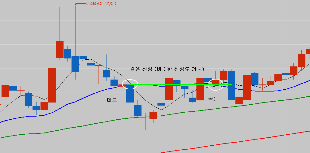 일봉에서 5일선이 20일선을 데드 크로스 하는 시점에서,