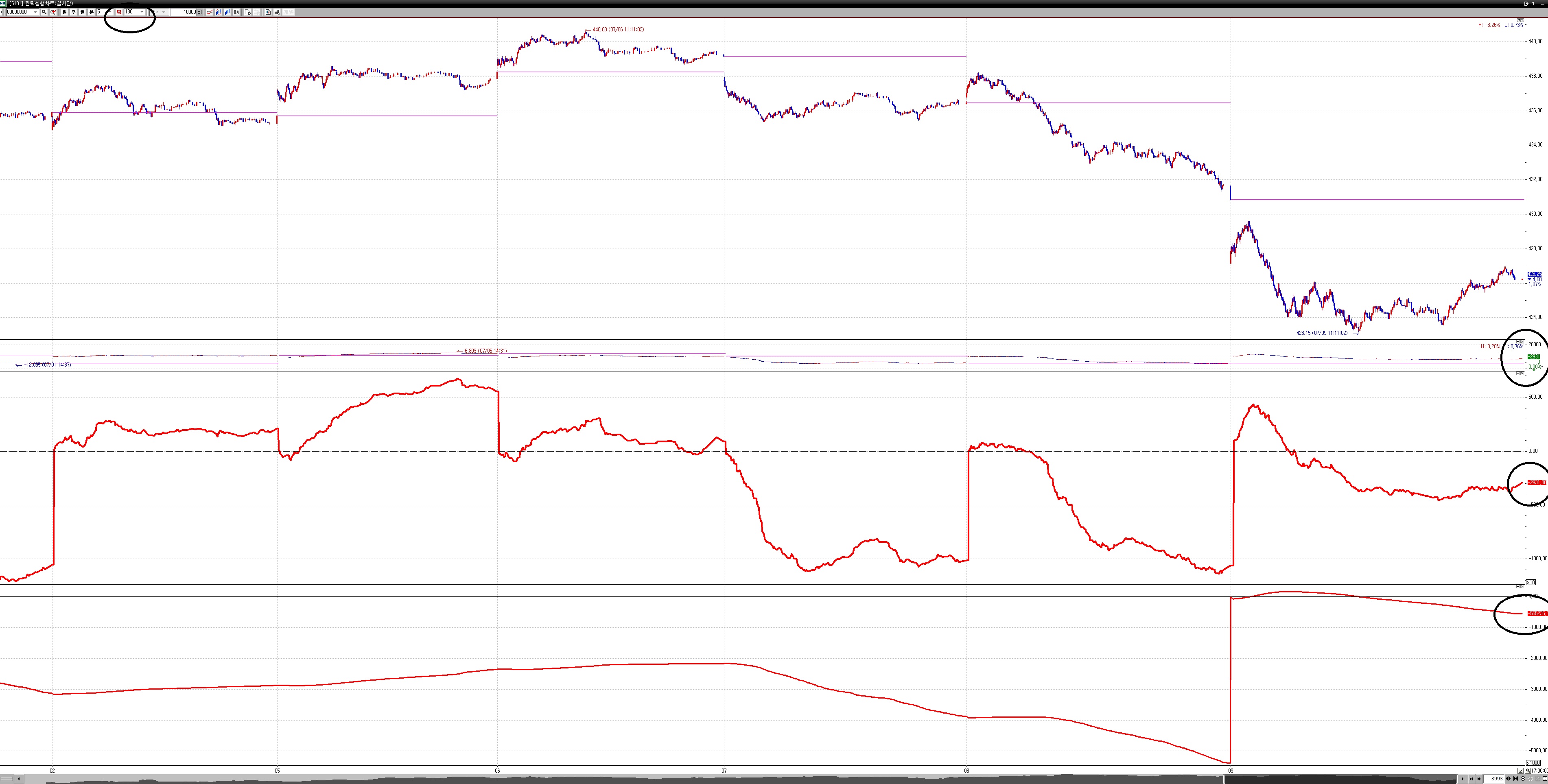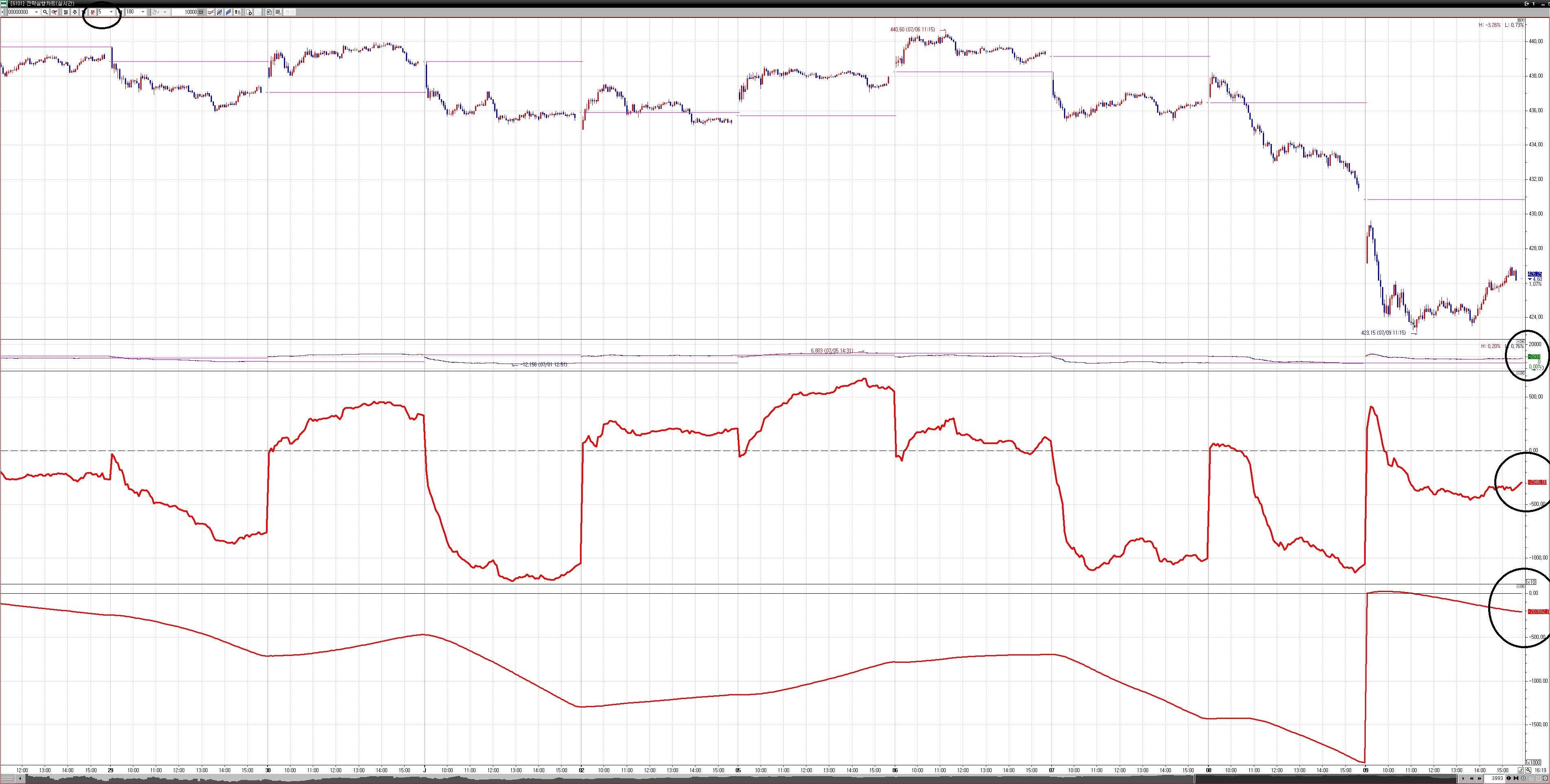 5분봉은 -2,931 -2,946 차이가 비슷하게 나지만 위 수식은 수치가 -20만, -55만 이렇게