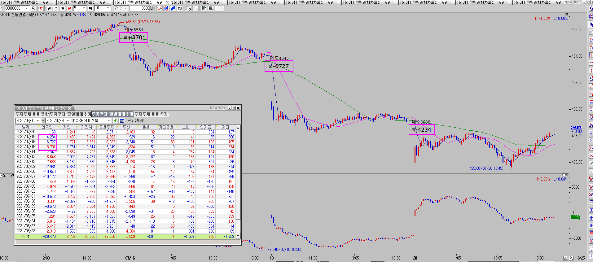 외국인 수량만 차트에 뒷날 아침 첫봉 완성해 표시하고 싶습니다.