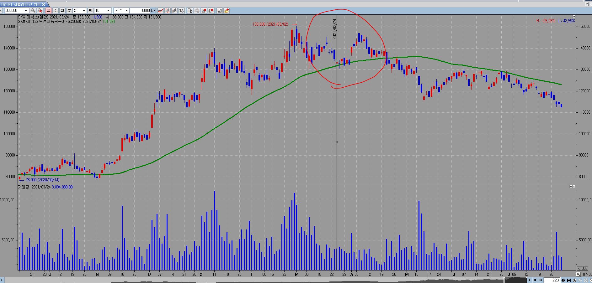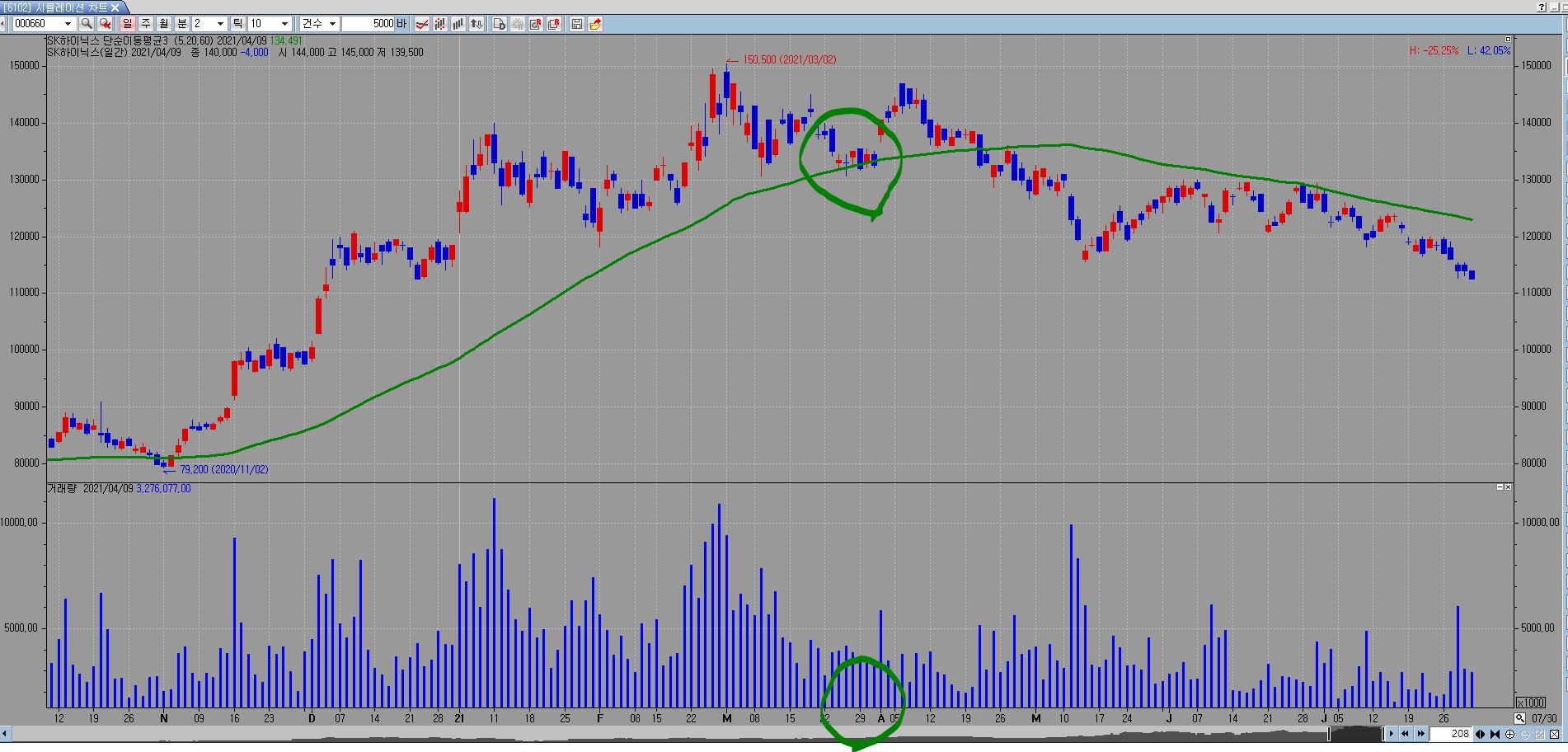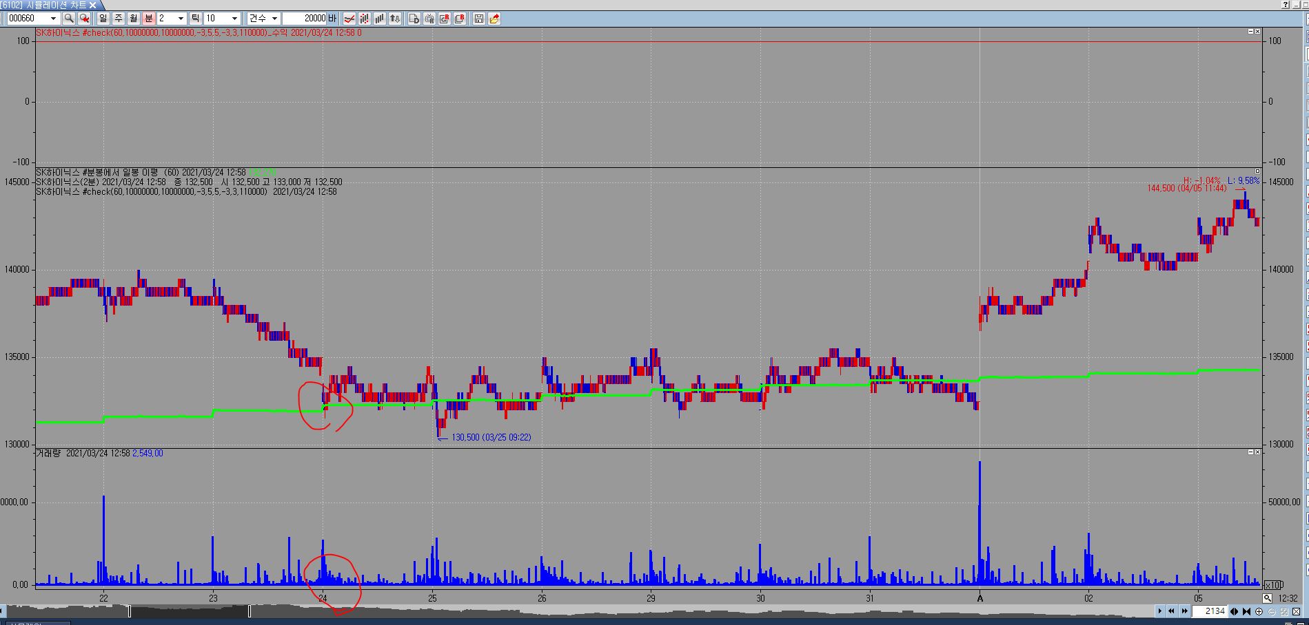 위 그림에서 보시다시피.. 일봉과 분봉인데.. 시스템식을 60일선 이탈시 매수로