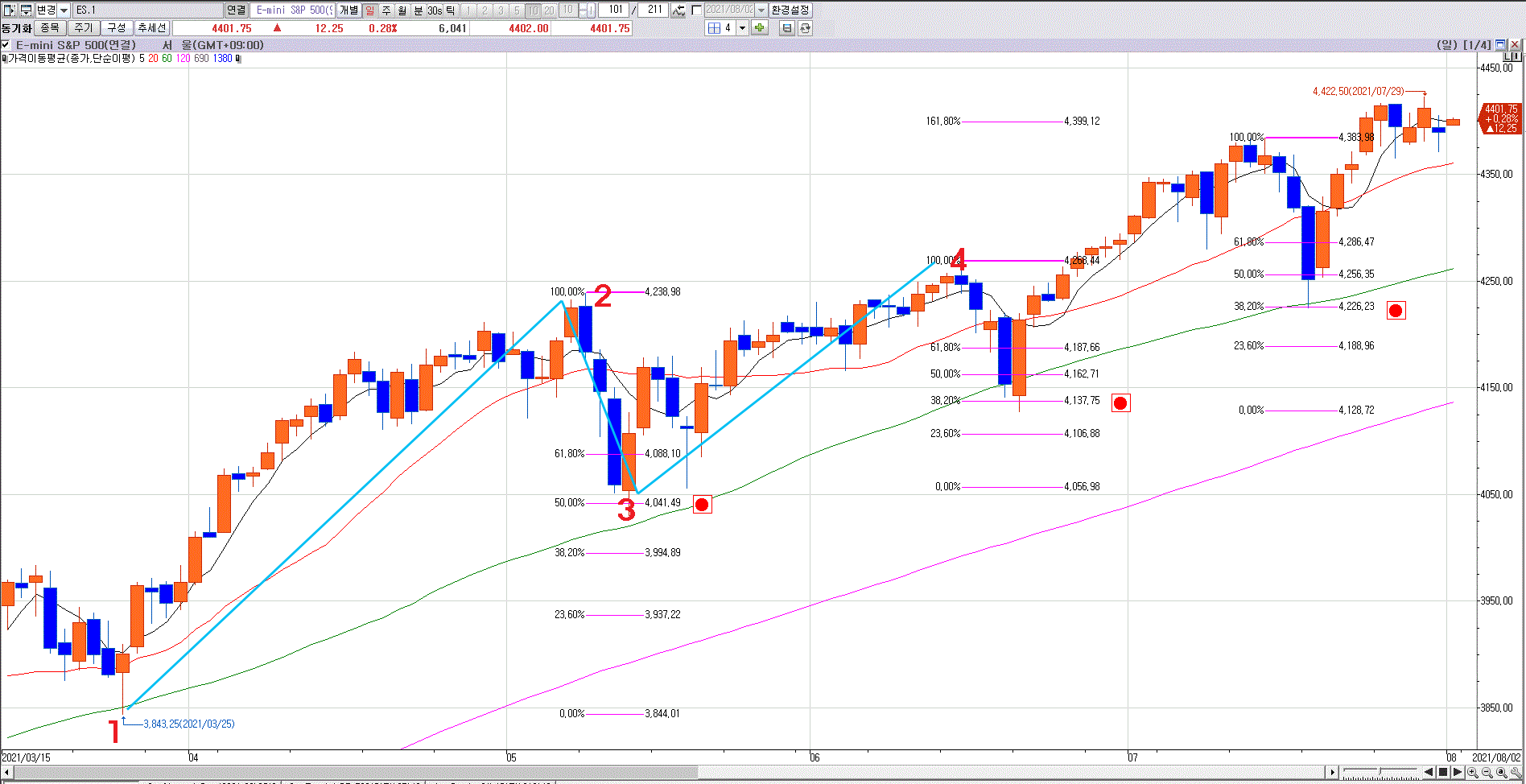 일봉에서 피보나치를 이용한 진입및 청산의 조건부 수식어를 하고자 합니다.