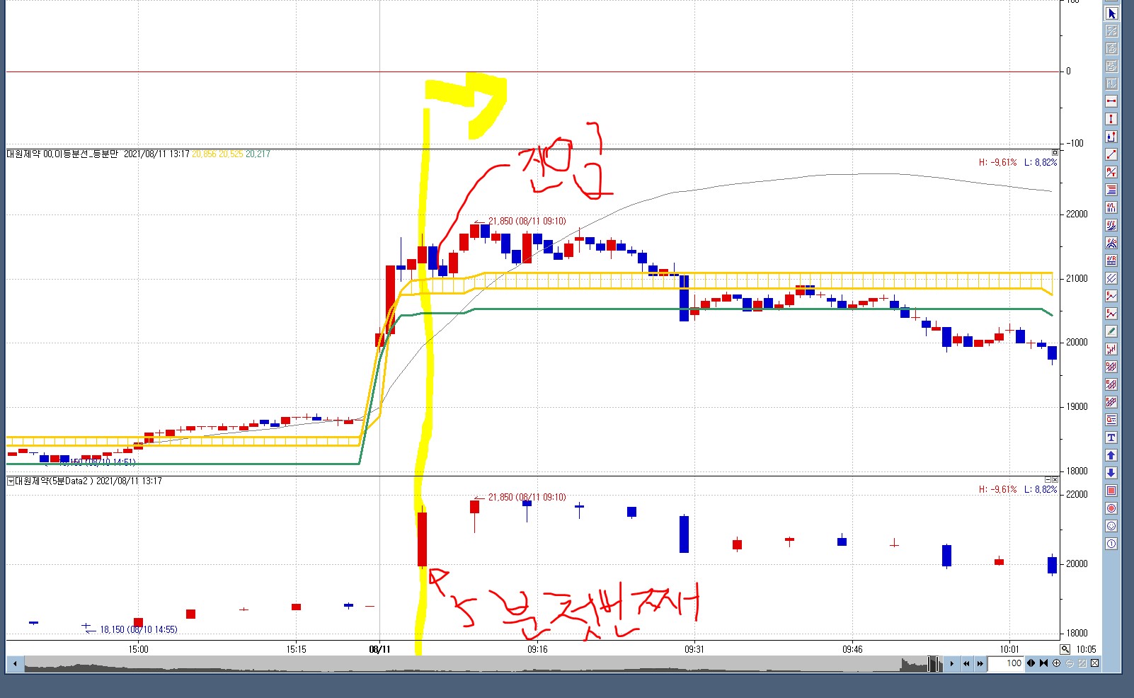 아래와 같이 짧은 주기인 기본차트 첫봉완성시에