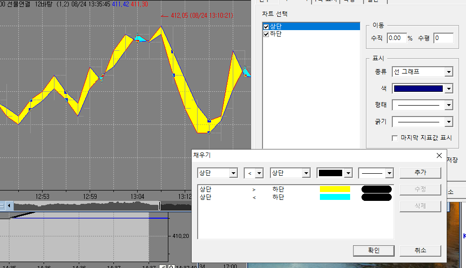 > 제목 : 2개 이평선사이에 조건에 맞는 색을 넣고싶습니다