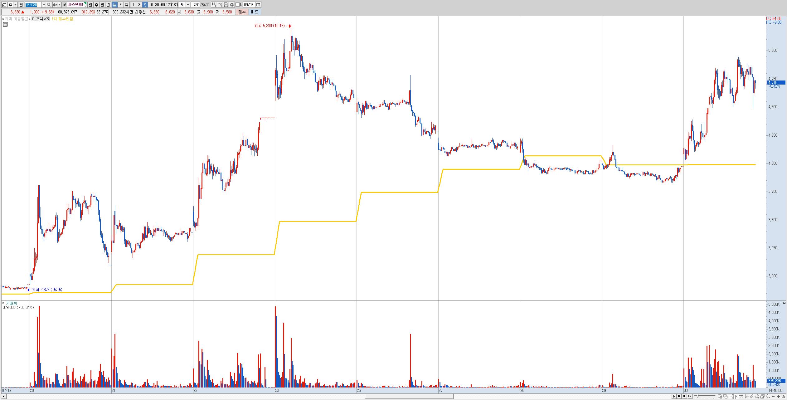 첨부파일은 키움영웅문에서 아즈텍WB의 황금선색 선이 5일 종가 이동평균값을 5분봉 차트에 표시한 것입니다. 골든크로스 시점은 7월 29일 오전입니다.