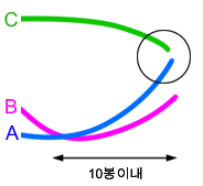 앞에서 이미 10봉이내에 A가 B를 골든크로스 했었고 그 이후에는 골든크로스든 데드크로스든 없었다가 A와 C가 골든크로스 전인 경우가 궁금합니다.