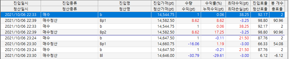 데모를 해보니 2계약이 진입되어 진행되는데, 한번은 목표실현가를 도달했는데도 청산이 안되다가 지정하지 않은 가격에 익절되었고 다음 한번은 2계약 모두 목표실현가를 넘었는데 청산되지 않고 있다가 1계약은 50틱 청산 되었고 남은 1계약은 약손절 되었습니다.