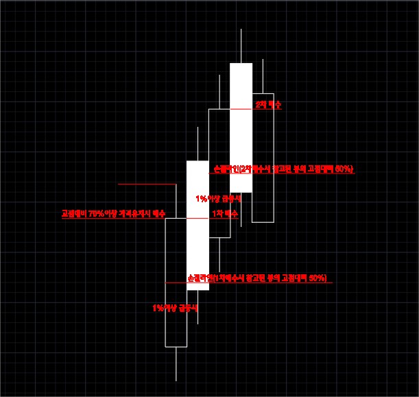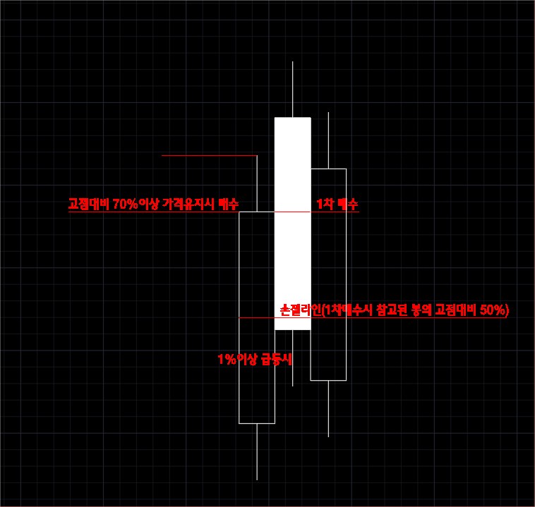1차 매수시 참고된 봉에서 가격이 50%이하로 빠지면 손절.