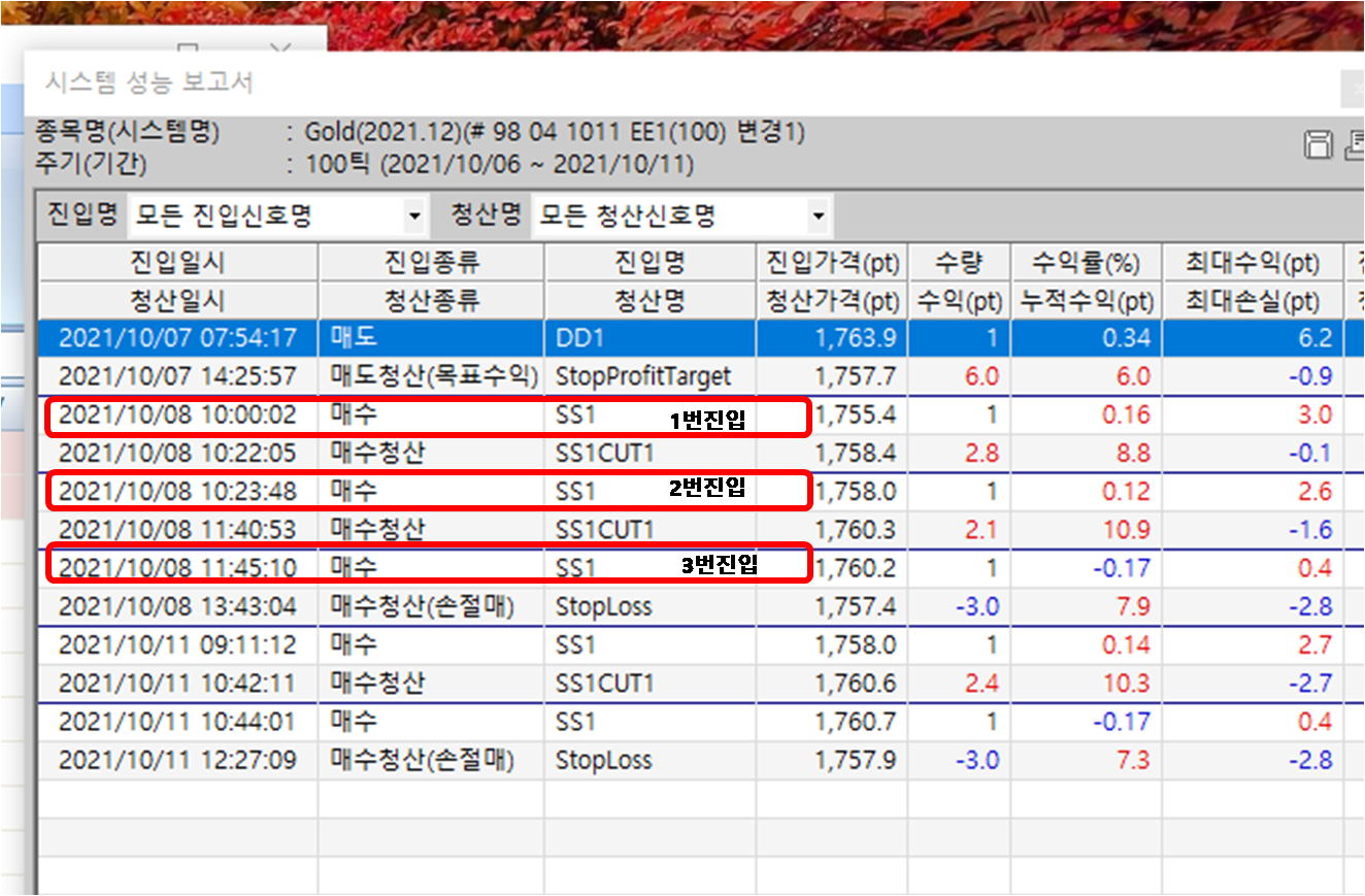 매수 진입후 수익이 10틱 이면 1차청산 1차청산후 10틱 아래면 2차 매수 재진입