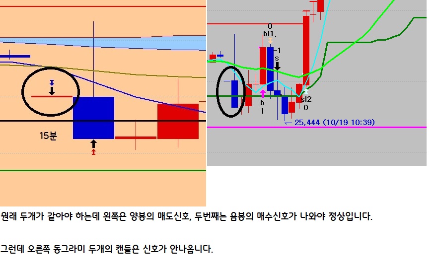 두번째봉은 음봉이지만 전봉이 이미 저가가 볼밴하단 아래이므로 신호가 발생하지 않습니다.