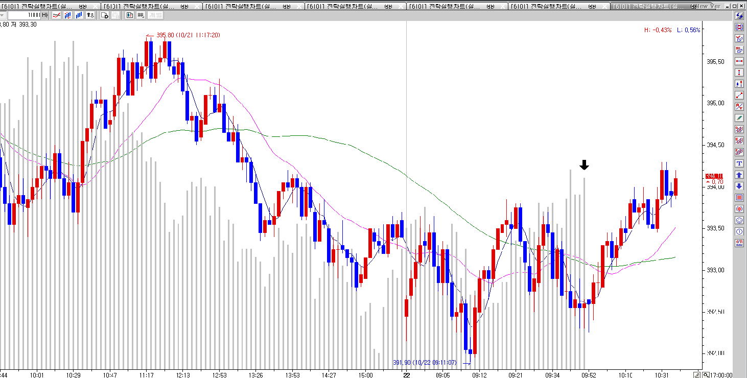 그래서 화살표에 표시 된것 처럼 현재봉 기준해서 뒤로 20봉 첫봉에만 막대가 나타나고