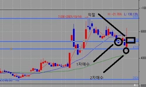 그리고, 보시면 고점을 기준을 주가가 아래로 하락하다가 해당타점에서 매수를