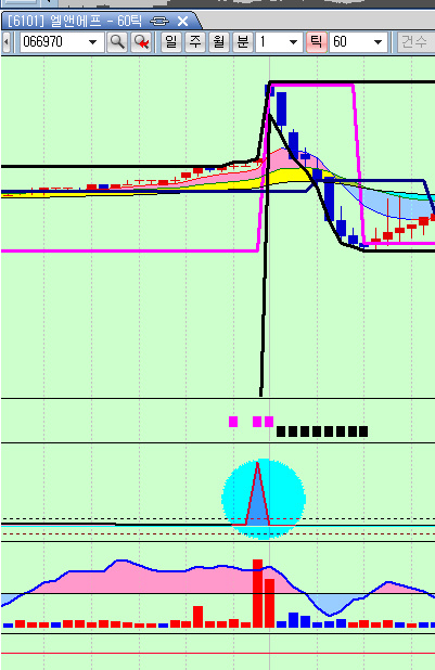 위 수식중 Plot4((Asks-Bids), "매수매도합"); 이 틱차트에서 그림과 같이 장초반에 뽀족하게 튀어 나와 보이지가 않네요(동그라미 친부분)