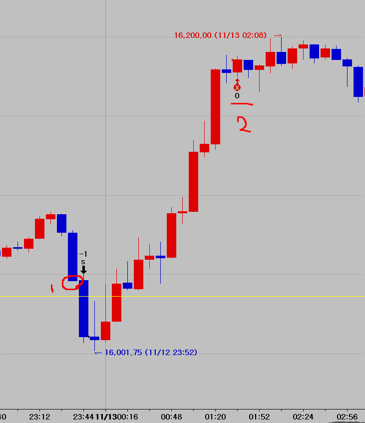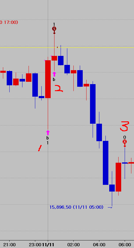 그리고 2번 진입한 것은 중간에 손절되지 않고 거래 종료시간에 청산(3번)했는데