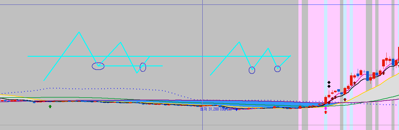 전 저점의 3일선 바닥을 이탈 했다가 다시 돌파 되었을때의 캔들을 찾아 주세요~~