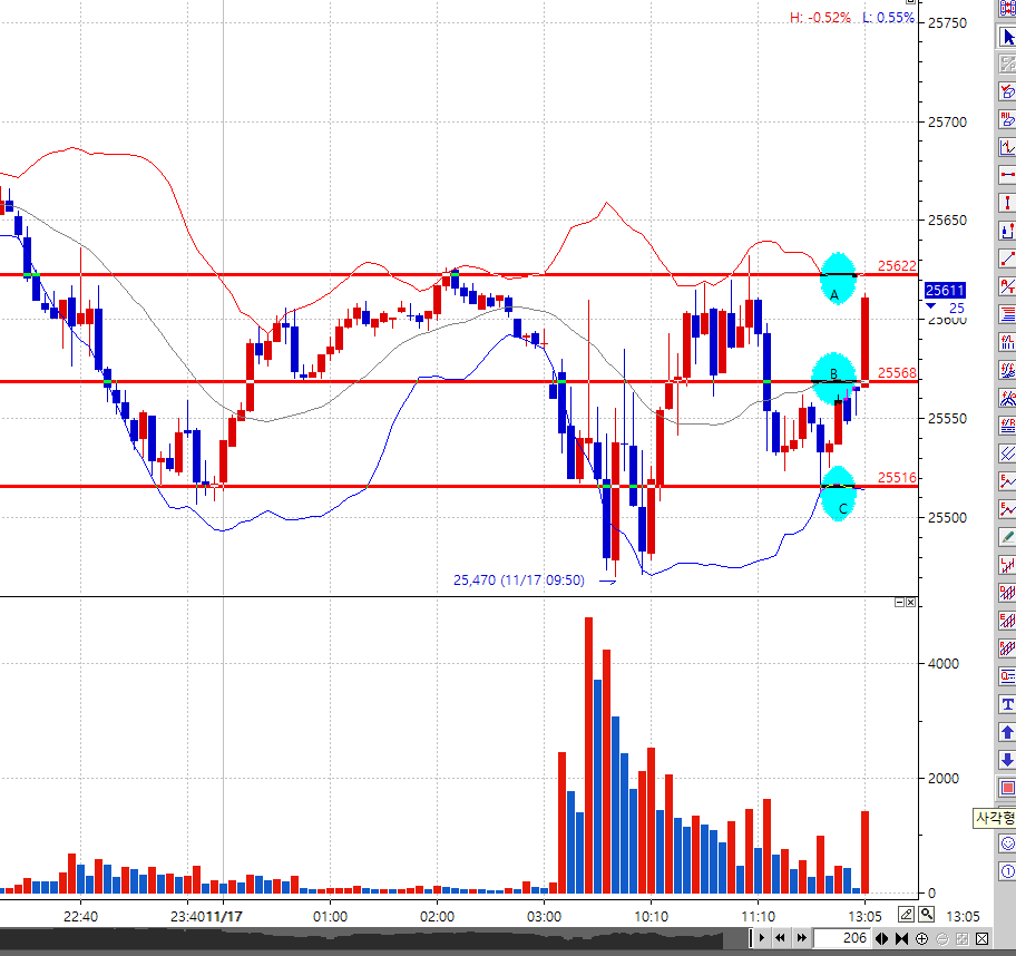 볼린져 밴드 상단 a가 움직임에 따라 빨간 수평선이 계속 따라다니는거죠..