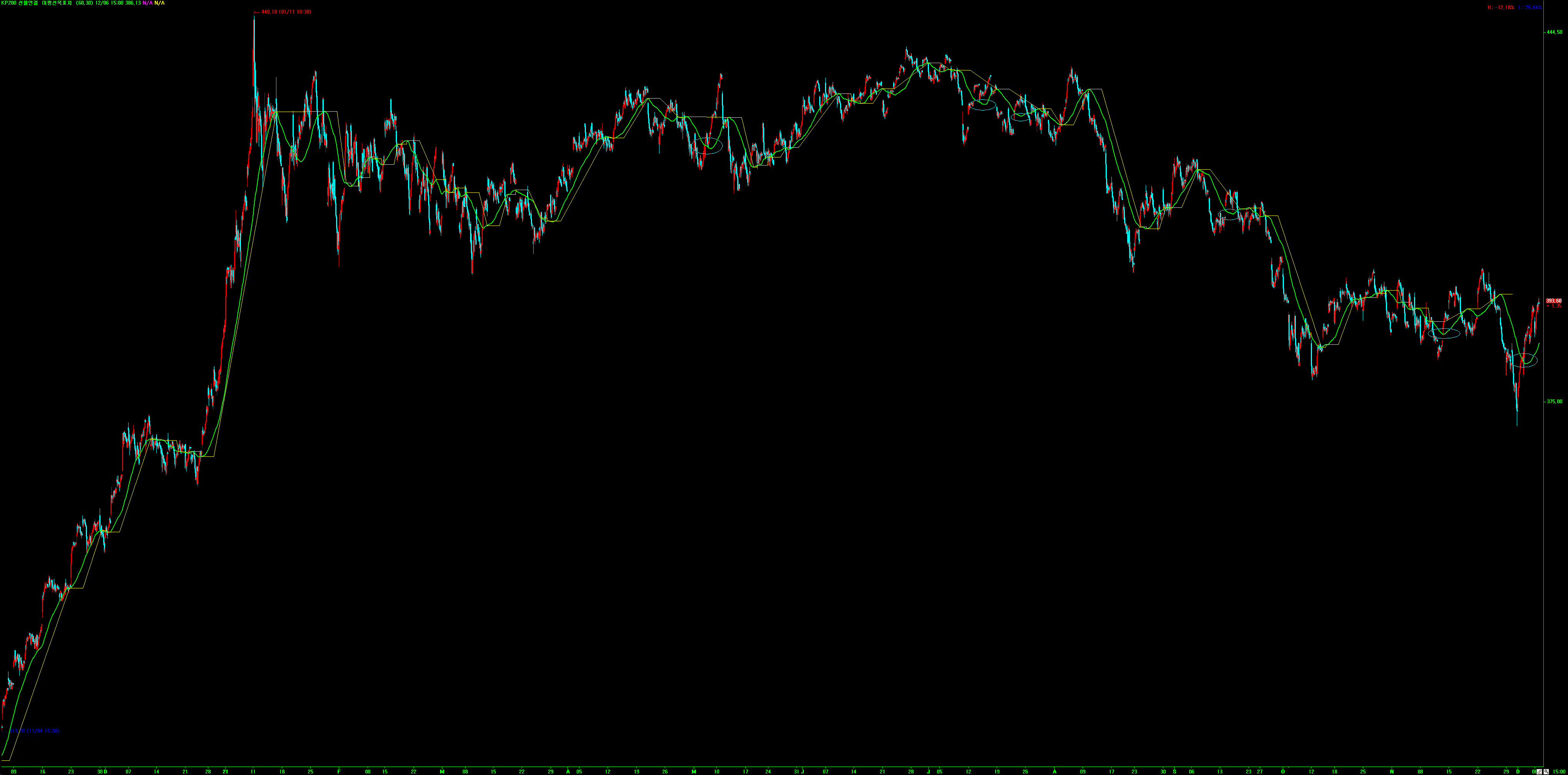 해당 차트는 선물 30분봉에 적용한 모습입니다. 동그라미 친 부근이 수평선이