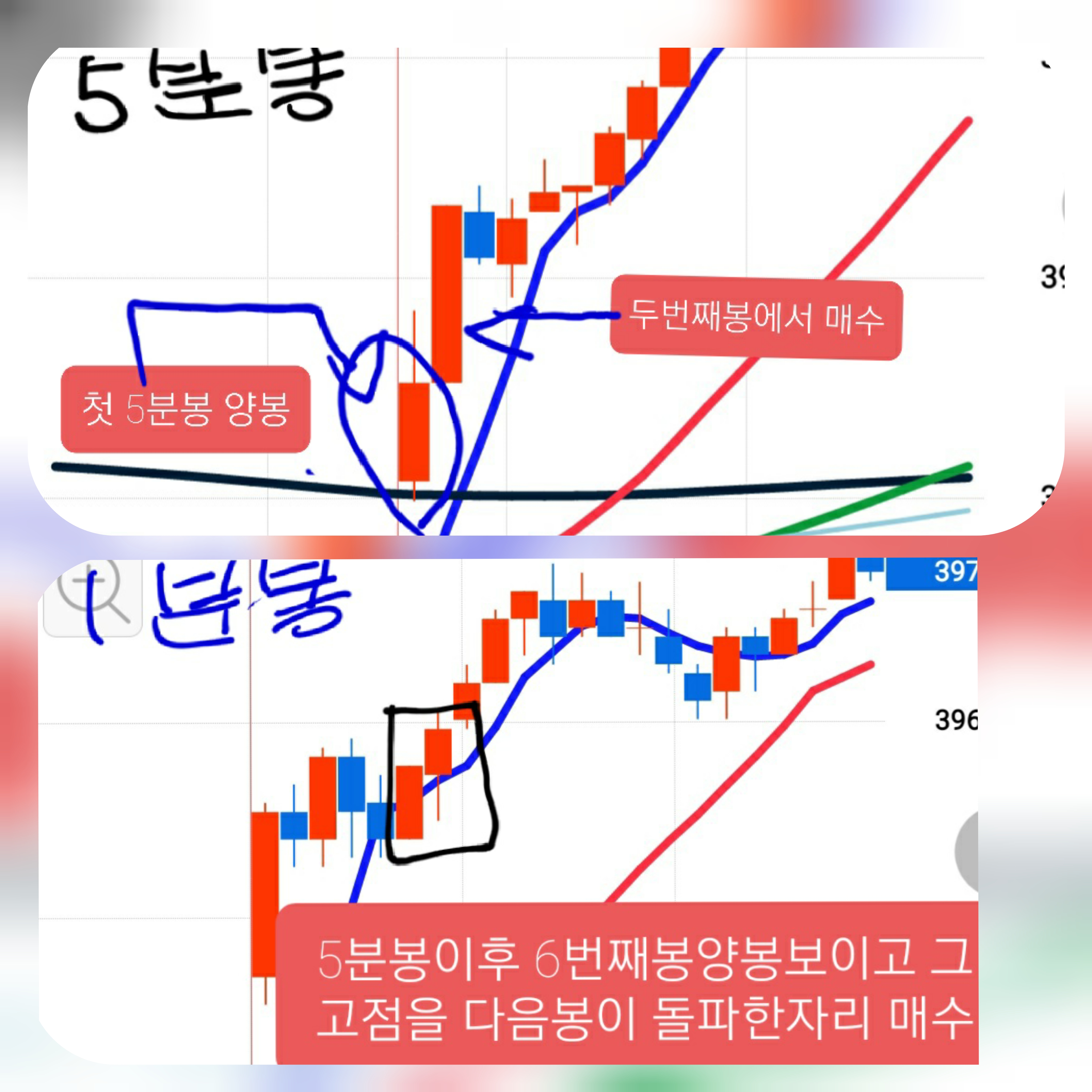단 다음봉 매수시점은 1분봉(5분봉 끝나후이니 5분이후부터 시작되는1분봉)이 양봉보이고 그 양봉의 고가를 다음1분봉이 돌파할때.
