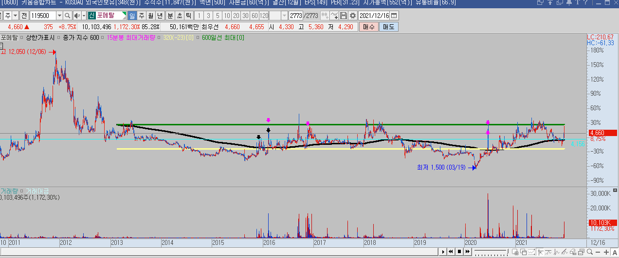 600일 이동평균선 최고점인 5,558원(초록색)의 40% 아래인