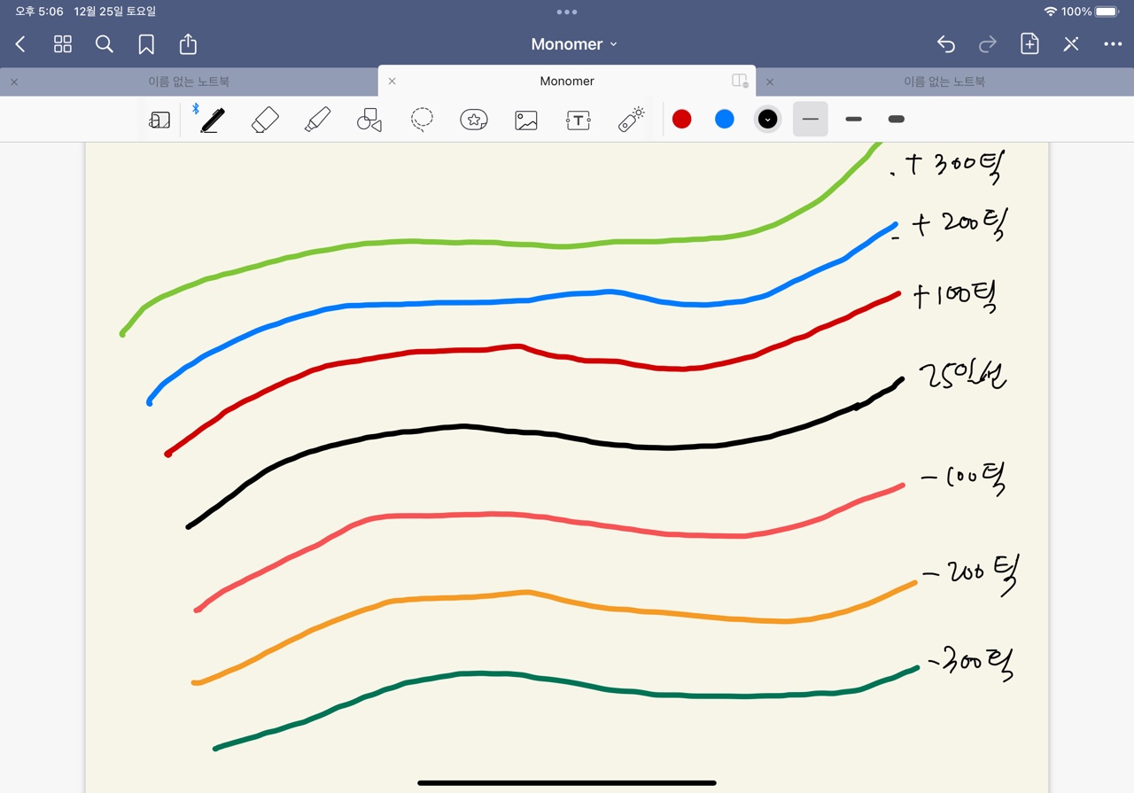 25일선을 기준으로 위로 +100틱, +200틱, +300틱, +400틱, 아래로 -100틱, -200틱, -300틱, -400틱 해당하는 위치들을 선으로 표시하도록 부탁 드립니다.