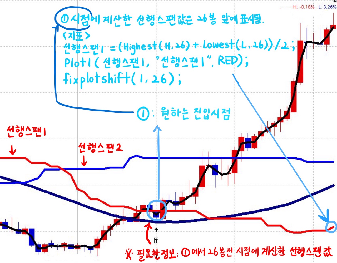 차트 상에서 선행스팬1을 돌파하는 자리에 매수를 하고 싶은데, 지금 시점의 선행스팬1 지표를 계산하는 방법을 모르겠습니다.