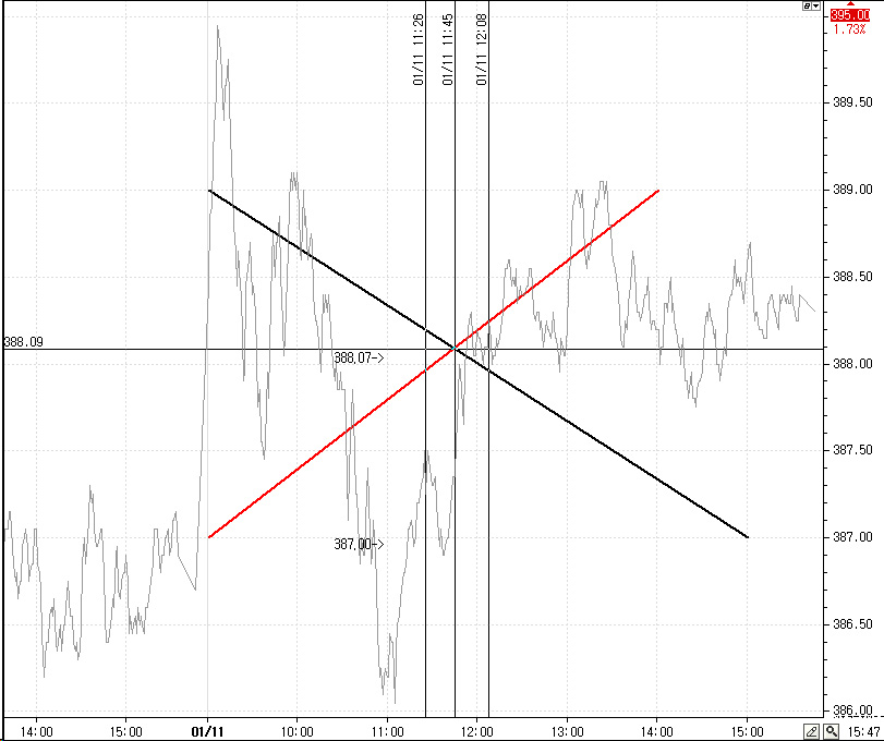 매봉 끝점이 이동하면서 경사각도 변경이 되어 다른추세선과 교차점이 계속 변경이 되고 최종 고정되는것은 15시입니다.