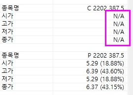 거래가 없을 경우 첨부한 그림 처럼 값이 N/A로 나오고