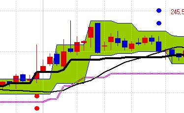 2. 후행스팬이 볼린저밴드10선 상단을 상향돌파할때 현재봉 위에 붉은점 강조 신호를 표시하고,
