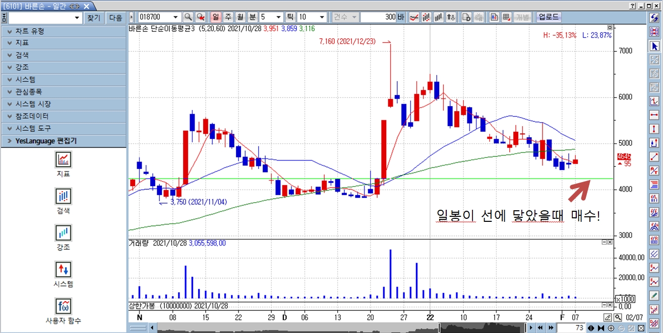 이후 주가가 움직이다가 일봉이 이 선에 닿았을때 제가 지정한 금액만큼