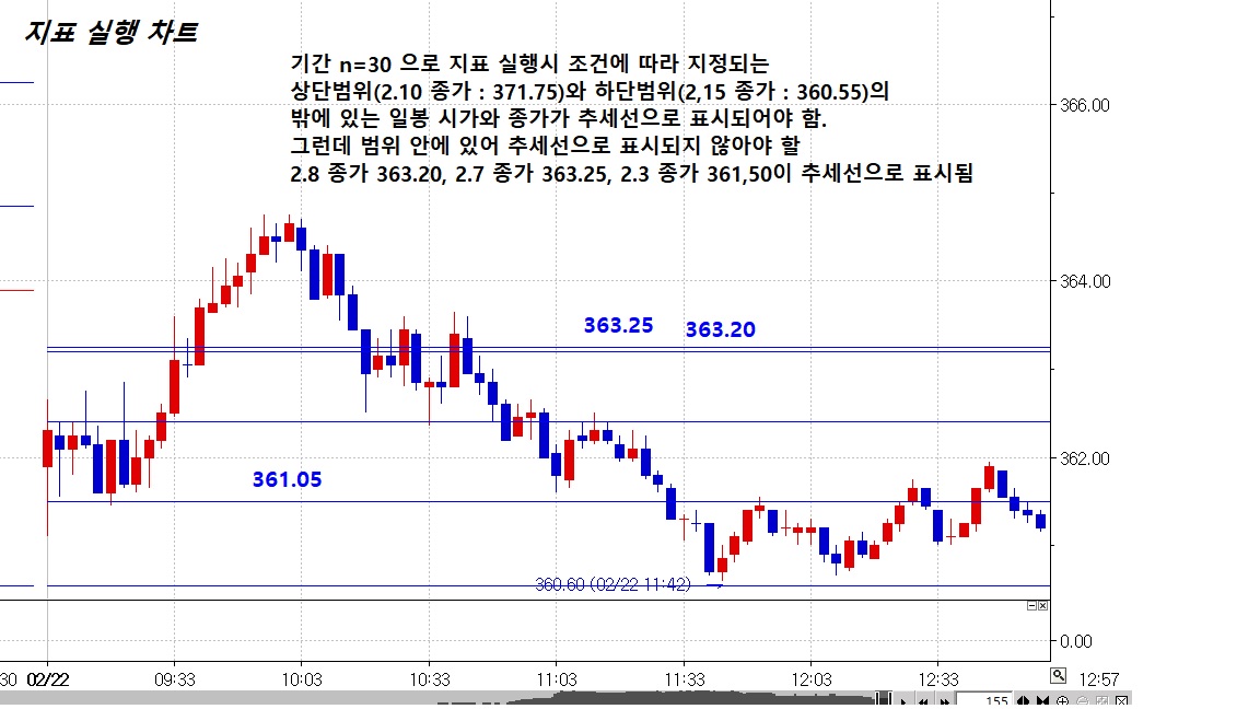지표 실행 결과는 당일(D)인 2022.2.22의 추세선 수치로 표시됩니다.