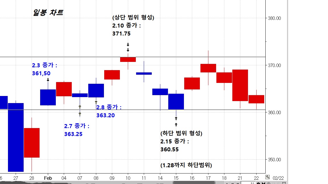 2.15 종가(360.55)로 새로운 하단범위, 2.10 종가(371.75)로 새로운 상단범위가 설정됩니다.