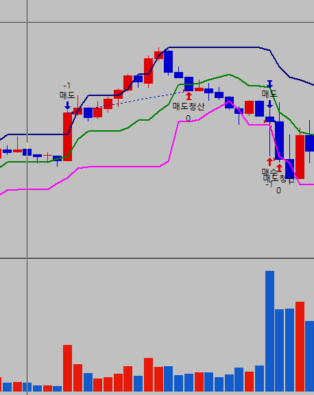 10일간의 (고점+저점)/2 에 닿으면 매수 또는 매도청산이 원하던 조건입니다
