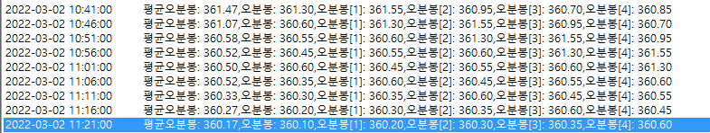 MessageLog("평균오분봉: %.2f,오분봉: %.2f,오분봉[1]: %.2f,오분봉[2]: %.2f,오분봉[3]: %.2f,오분봉[4]: %.2f", WMA(오분배열[0], 5), 오분배열[0], 오분배열[1], 오분배열[2], 오분배열[3], 오분배열[4]);