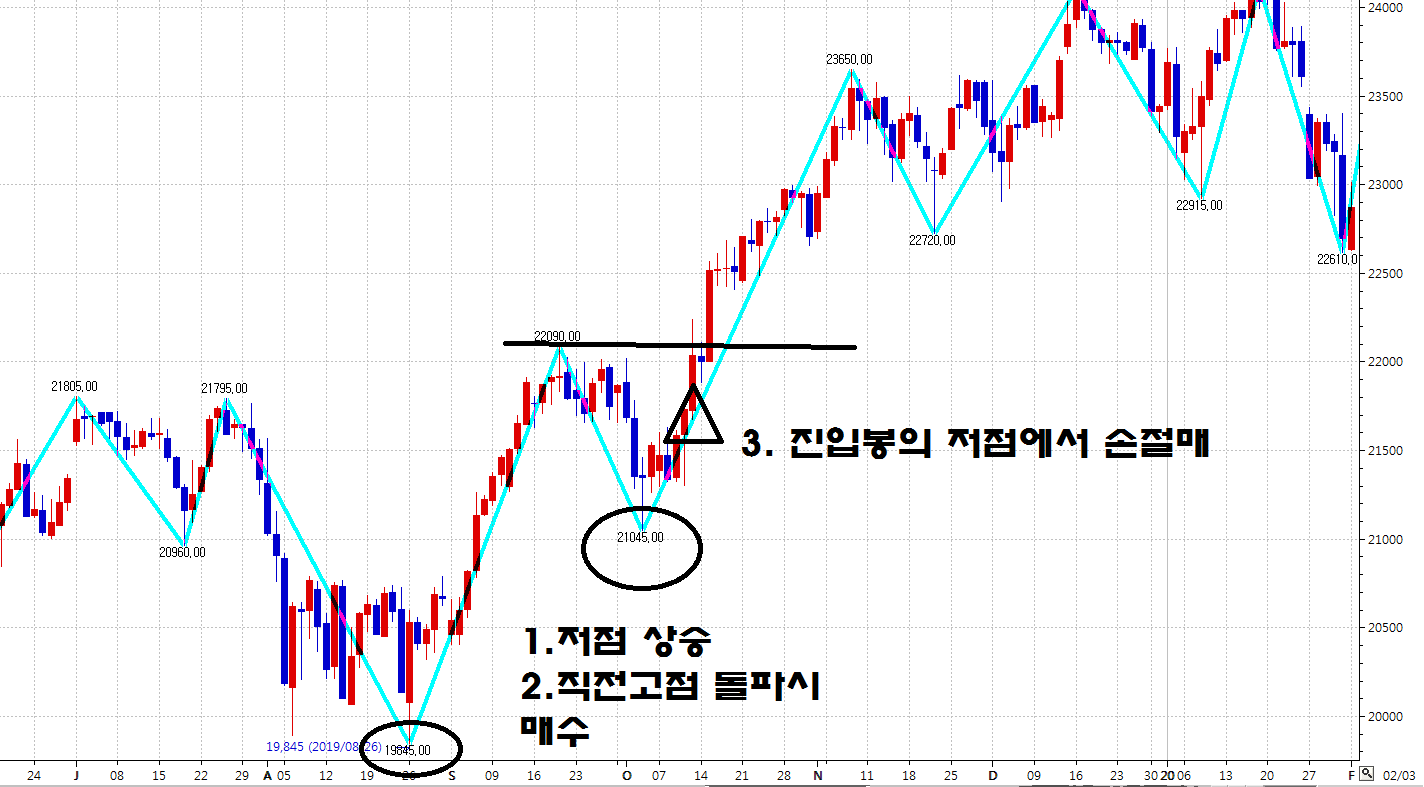 1. 아래와 같은 지그재그 지표의 저점과 고점을 활용하여