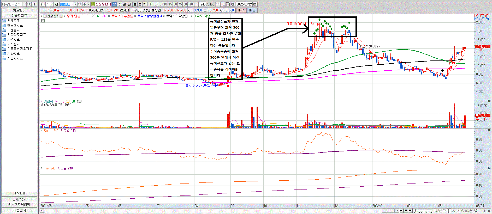 참고로 첨부사진에서 분홍색 굵은선이 240 이동평균선이고 녹색신호가 나타난곳이