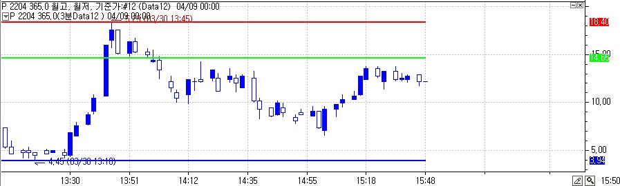 파일 첨부합니다. 풋의 종가가 3.86인데.. 이녀석의 기준가가(연두색 선) 13.25입니다.