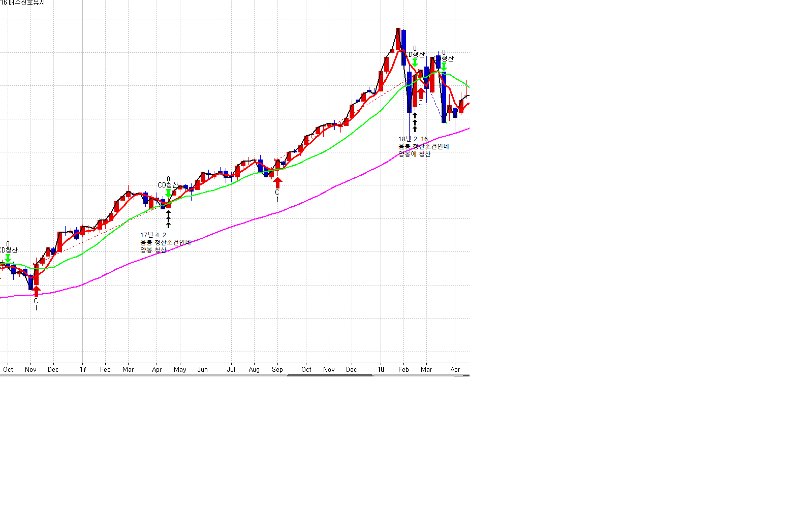 매수 진입신호 "c", "d" 이후 청산조건은 음봉으로 설정했는데