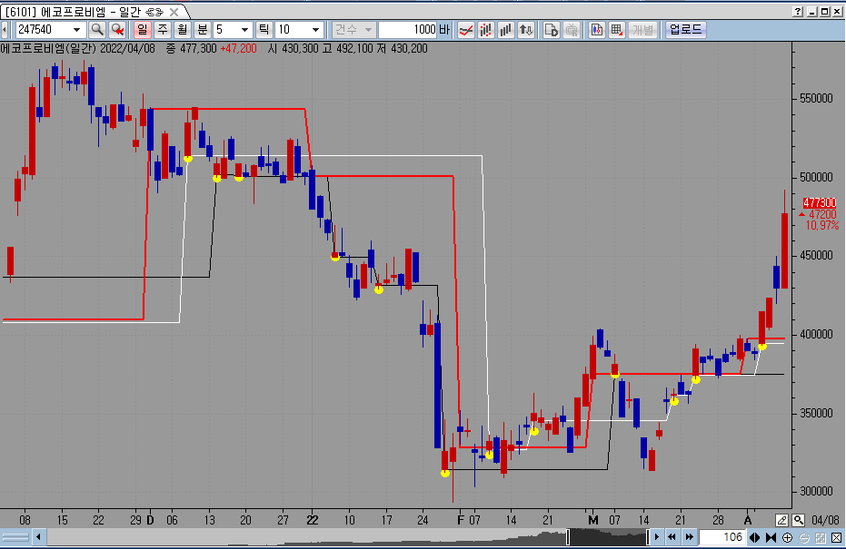 위 지표식을 적용하여 에코프로비엠(첨부한 그림)을 보면