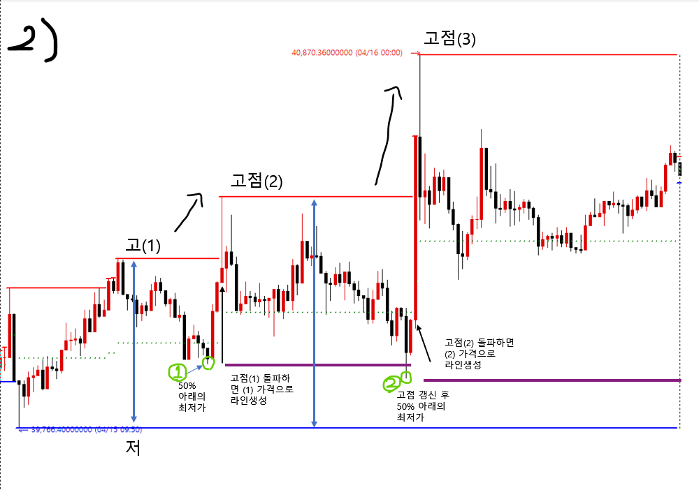 고점이 갱신되면 이전의 50%아래 최저가의 라인이 나오게 하고 싶습니다