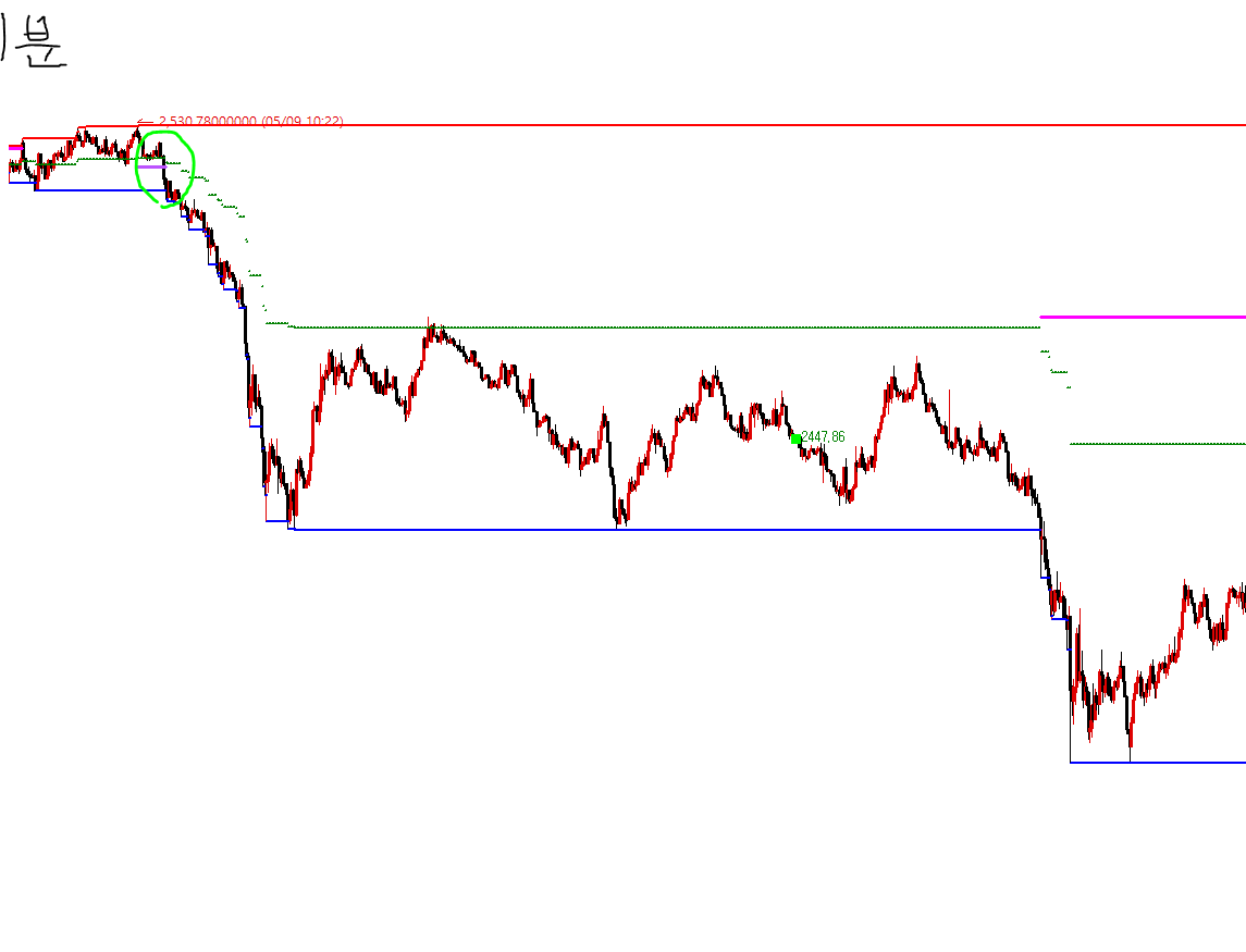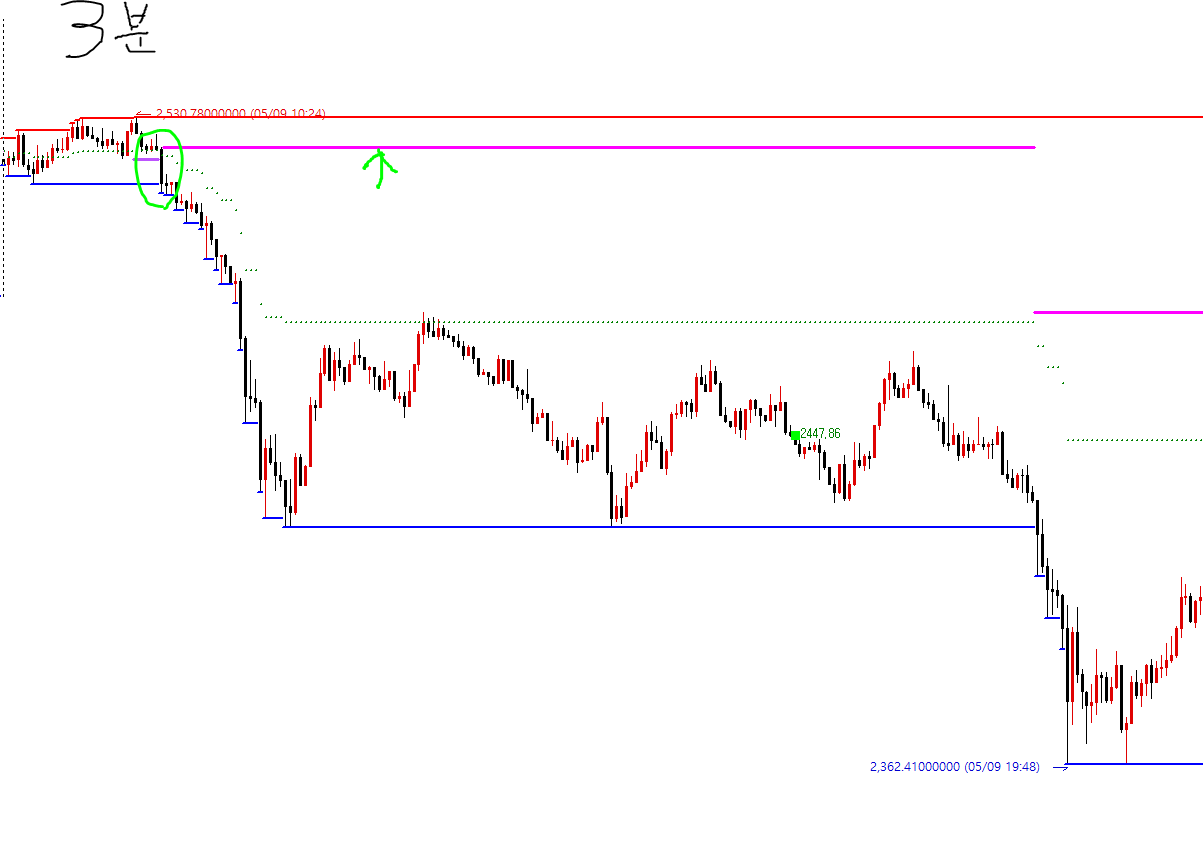 사진과 같이 1분봉에는 정확하게 그려지는데 3분봉에서는 나오지 말아야 할 라인이 생깁니다