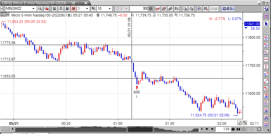 첨부한 사진상의 세로선으로 표시한 01:08에 가격이 11713을 crossdown해 수식대로 LL[5] == 11713을 바뀌고, 다른 선들도 다시 셋팅되었습니다