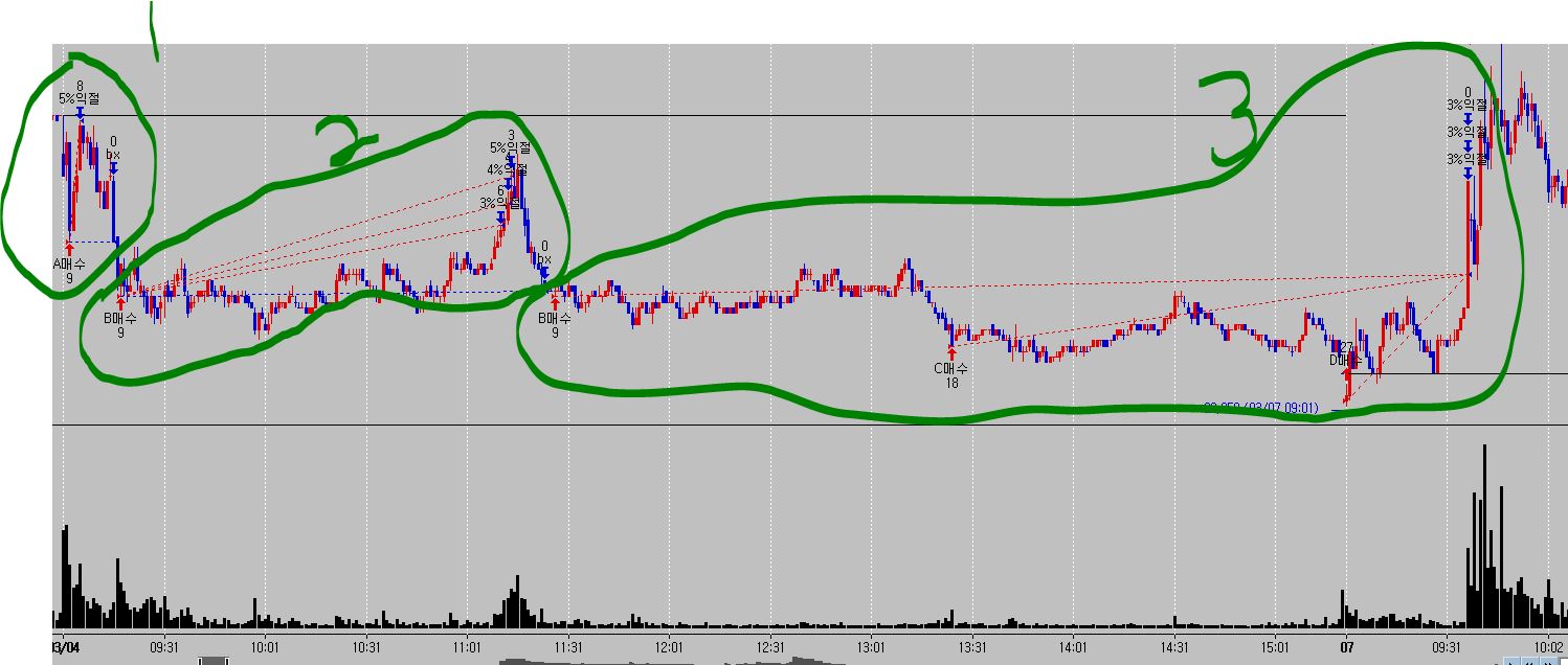 3. 3번 동그라미에서는 B, C, D 에서 매수가 되었고, 3%에서 전량 매도청산되었는데, 해당부분에서는 4, 5, 7, 10%의 분할익절이 왜 적용안되었는지 궁금합니다.
